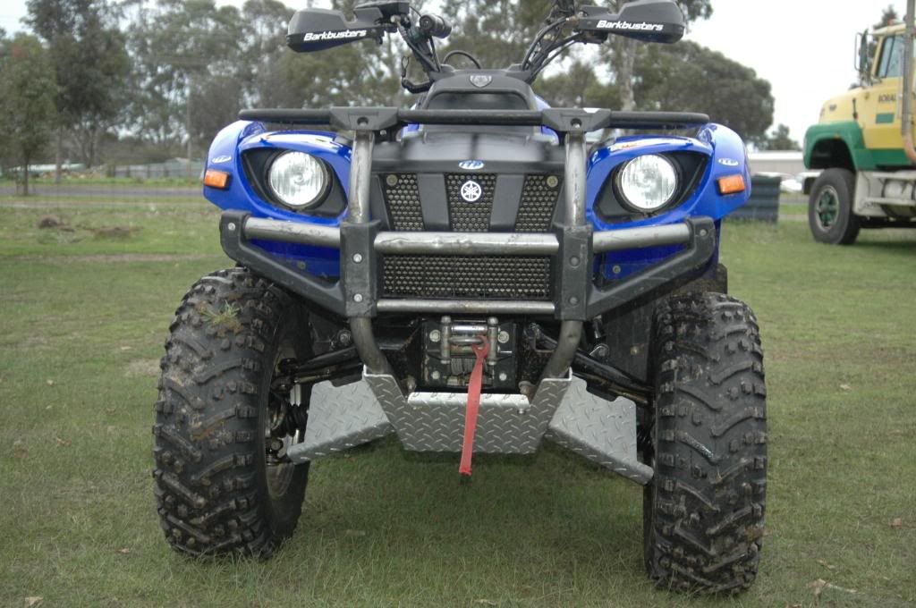 Ok here goes it is an 05 Yamaha Grizzly 660 cc It has highlifter bash plates from front to back ,it is a 2 piece system which required no drilling as it is a retrofit to existing mounts and holes already on the quad, the bash plates were added at a cost of over 600 dollars