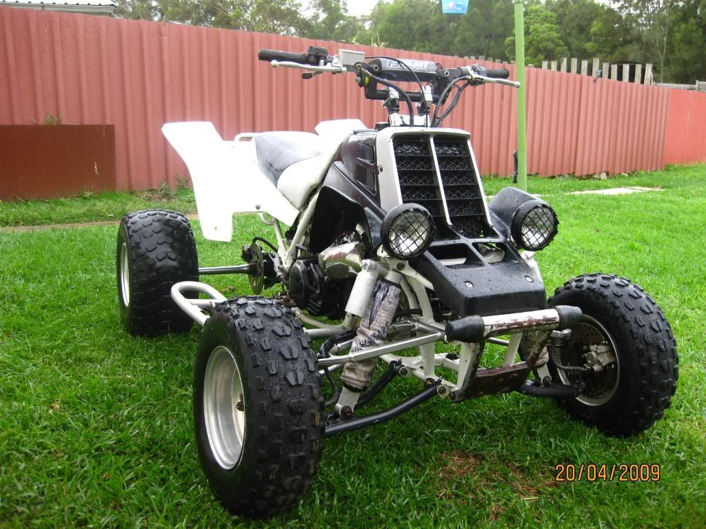 | ozquad, easy to fit the 450 front end, just have to cut the arms down a bit, easy to do with a grinder, shocks bolt straight up, handling is F...ing AWESOME. |